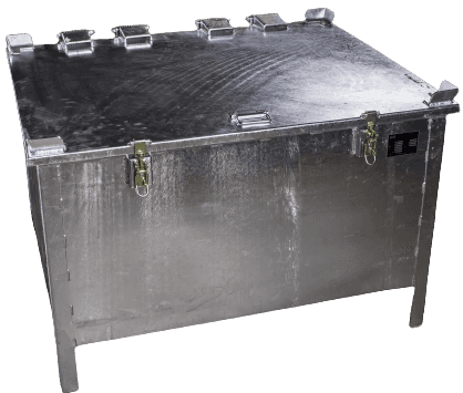 Die verzinkte Lagerbox von Genius ist ein doppelwandiger Metallbehälter mit PyroBubbles® für die sichere Lagerung von Lithium-Ionen-Batterien und Gefahrstoffen.